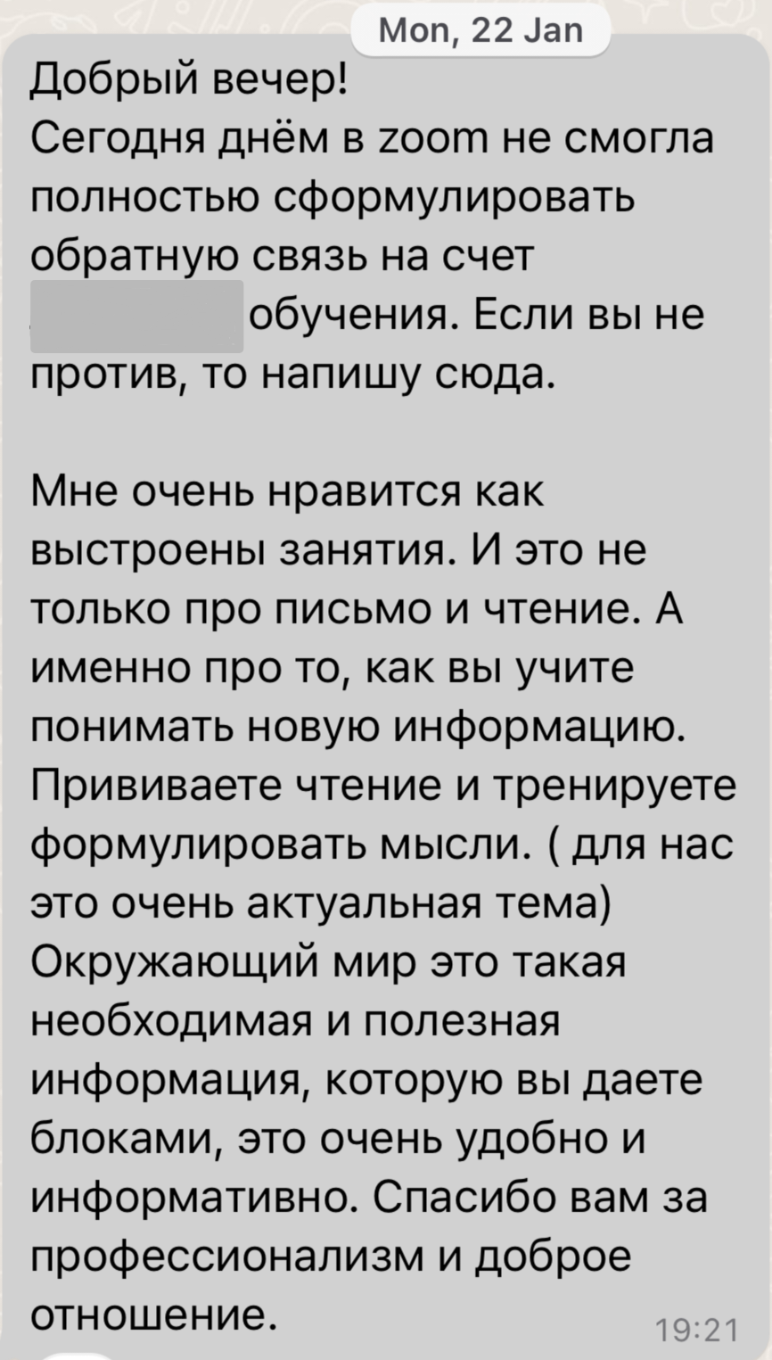 Моя школа – это маленькое уютное гнездышко, где каждый ребенок получает много внимания. Дети занимаются в мини-группах, изучают русский язый, литературное чтение и окружающий мир.
